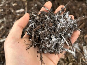 【※菌ちゃん(糸状菌のついた木のチップ)と菌ちゃん畝たての様子】